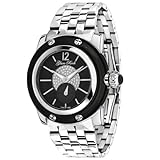 Make a statement every day with the eye-catching Glam Rock Women's Palm Beach Collection Diamond-Accented Watch. The round polished silver-toned stainless steel case and bezel feature a black ion-plated case cover and black cabochon crown. The striking black dial displays a silver-toned Arabic numeral in the twelve o'clock position and long rectangular silver-toned indices at all remaining hour positions. The center of the dial is set with 52 beautiful white diamonds behind the luminous, silver-toned hour and minute hands, a silver-toned second hand, and a 60-second subdial that is clearly displayed above the six o'clock position. The silver-toned stainless steel band fits comfortably and securely fastens by push-button deployment clasp. This timepiece offers reliable Swiss quartz movement and is protected by an antireflective sapphire crystal. The watch is water resistant to a depth of 330 feet (100 meters). Precise Swiss-quartz movement Scratch-resistant sapphire crystal; stainless steel case with black ion-plated cover; stainless steel bracelet 60 second subdial Black textured dial with silver-tone hands, hour markers and arabic numeral 12; luminous; 52 white diamonds set on dial; black cabochon crown Water-resistant to 330 feet (100 M)