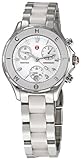 Stainless steel case with a stainless steel bracelet with white ceramic center links. Fixed white ceramic bezel with Michele lettering. White enamel dial with silver-tone hands and Arabic numeral hour markers. Minute markers around the outer rim. Luminescent hands and markers. Date display appears at the 6 o'clock position. Chronograph - three sub-dials displaying: 60 seconds, 30 minutes and 1/10th of a second. Battery operated quartz movement. Scratch resistant mineral crystal. Solid case back. Case diameter: 35 mm. Deployment clasp. Water resistant at 50 meters / 165 feet. Michele Tahitian Ceramic White Bezel Ladies Watch MWW12C000002. Quartz movement Durable mineral crystal protects watch from scratches Case diameter: 35 mm Stainless-steel case Water-resistant to 165 feet (50 M)